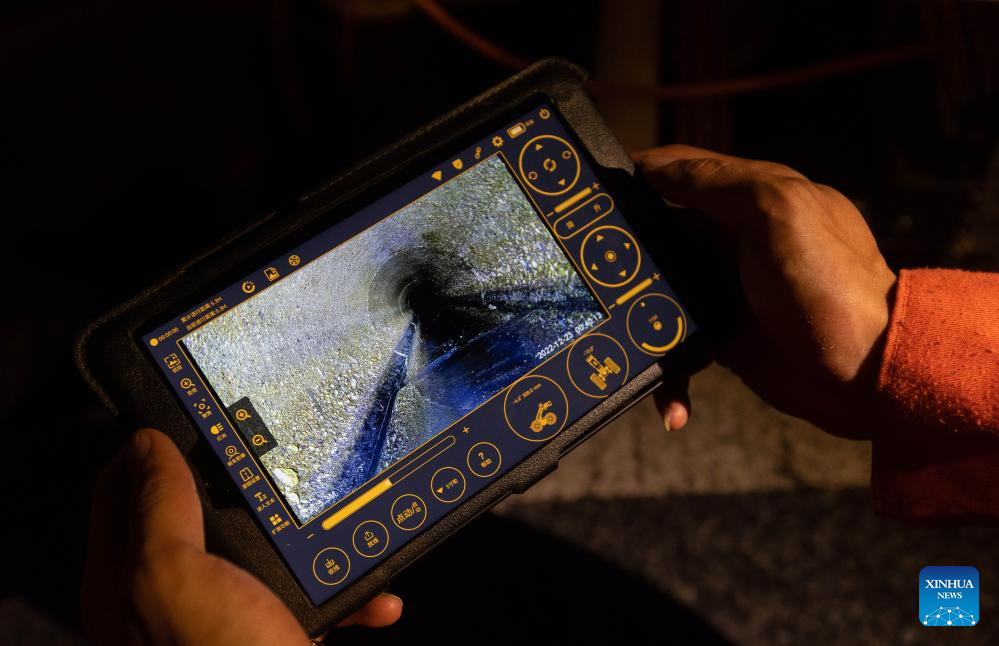 A worker controls a testing robot checking at a sewage pipeline in Chengdu, capital of southwest China's Sichuan Province, June 16, 2023. (Xinhua/Jiang Hongjing)