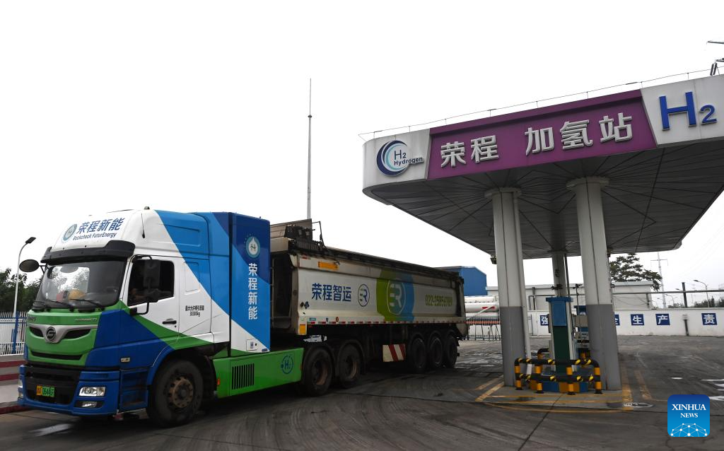 A hydrogen-fuelled heavy truck leaves a hydrogen refueling station of the Rockcheck Group in Tianjin, north China, July 13, 2023. To achieve carbon reduction and improve energy efficiency, Tianjin has pushed forward the comprehensive transformation of its iron and steel industry chain in recent years. Iron and steel producers are encouraged to reform their energy mix, upgrade technology and develop hydrogen-fuelled transportation.