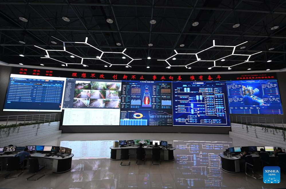 Staff members work at the industrial internet operation center of the New Tianjin Steel Group in Tianjin, north China, July 12, 2023. To achieve carbon reduction and improve energy efficiency, Tianjin has pushed forward the comprehensive transformation of its iron and steel industry chain in recent years. Iron and steel producers are encouraged to reform their energy mix, upgrade technology and develop hydrogen-fuelled transportation.