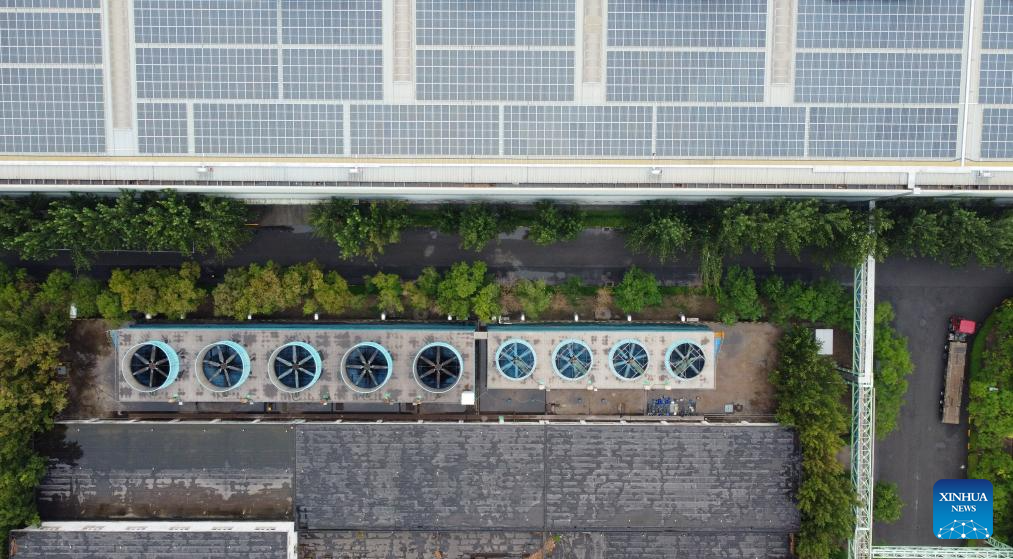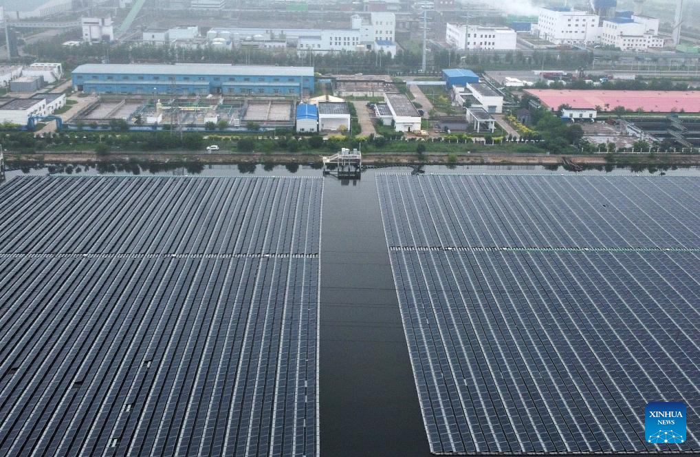 This aerial photo taken on July 13, 2023 shows a solar power plant of the Rockcheck Group in Tianjin, north China. To achieve carbon reduction and improve energy efficiency, Tianjin has pushed forward the comprehensive transformation of its iron and steel industry chain in recent years. Iron and steel producers are encouraged to reform their energy mix, upgrade technology and develop hydrogen-fuelled transportation.