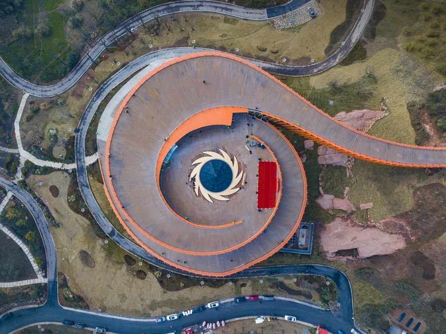 This aerial photo taken on Dec. 31, 2019 shows the Sun and Immortal Birds Gold Ornament on an observation deck of Longquanshan Forest Park in Chengdu of southwest China's Sichuan Province. (Photo by Hu Datian/Xinhua)