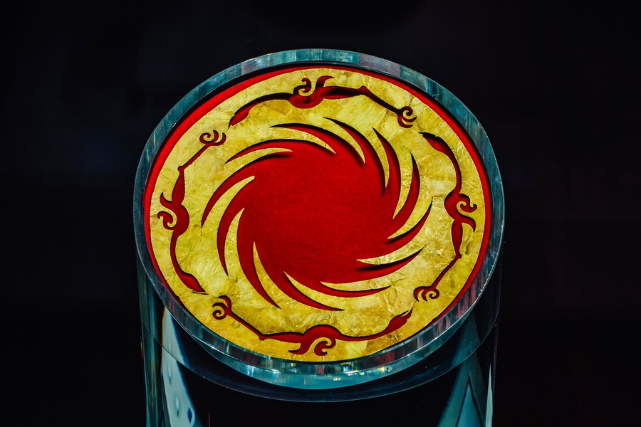 The Sun and Immortal Birds Gold Ornament is seen on the dome of the Jinsha Site Museum in Chengdu of southwest China's Sichuan Province on March 10, 2022. (Photo by Zhang Yan/Xinhua)