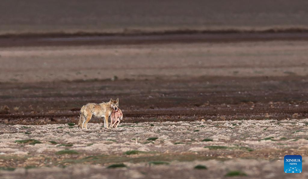 This photo taken on July 10, 2023 shows a wolf with a baby Tibetan antelope in its mouth in the Altun Mountains National Nature Reserve in northwest China's Xinjiang Uygur Autonomous Region. (Xinhua/Wang Peng)