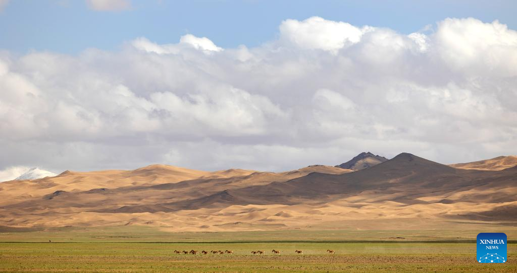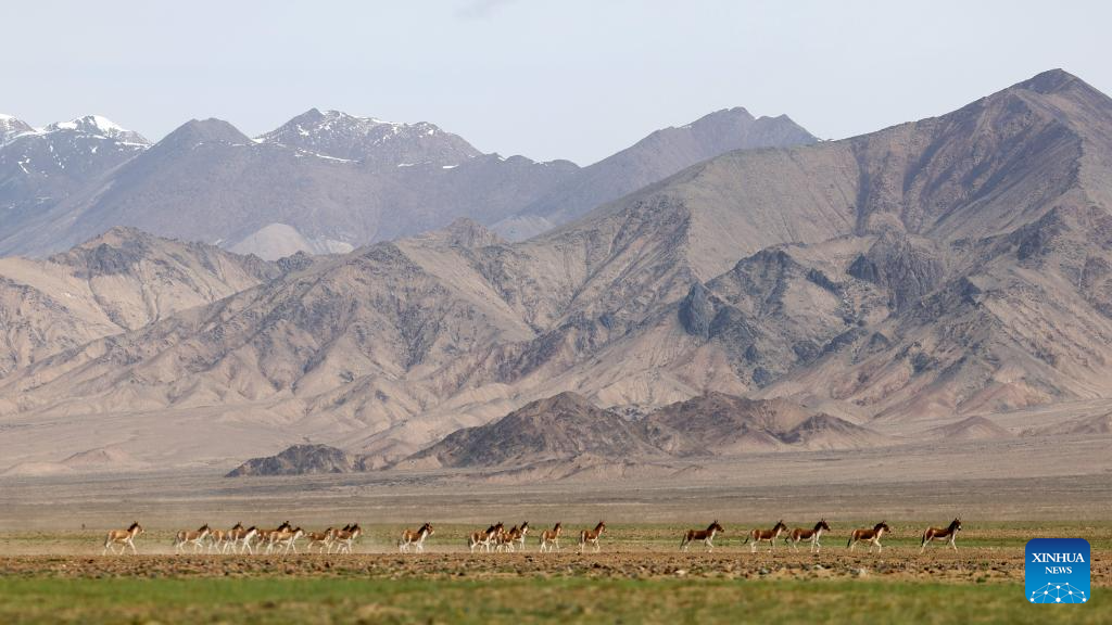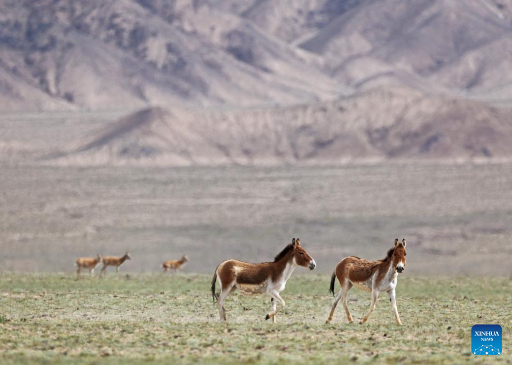 This photo taken on June 30, 2023 shows Tibetan wild donkeys in the Altun Mountains National Nature Reserve in northwest China's Xinjiang Uygur Autonomous Region. (Xinhua/Cai Yang)