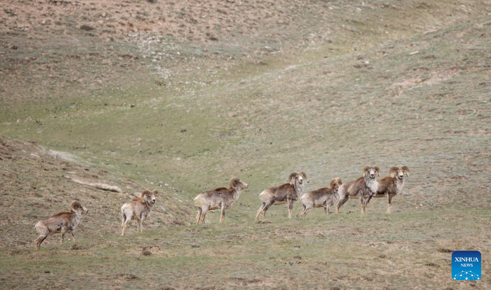 This photo taken on June 30, 2023 shows argalis in the Altun Mountains National Nature Reserve in northwest China's Xinjiang Uygur Autonomous Region. (Xinhua/Cai Yang)