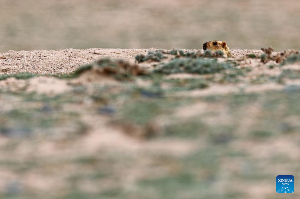 This photo taken on June 30, 2023 shows a Himalayan marmot (Marmota himalayana) in the Altun Mountains National Nature Reserve in northwest China's Xinjiang Uygur Autonomous Region. (Xinhua/Cai Yang)