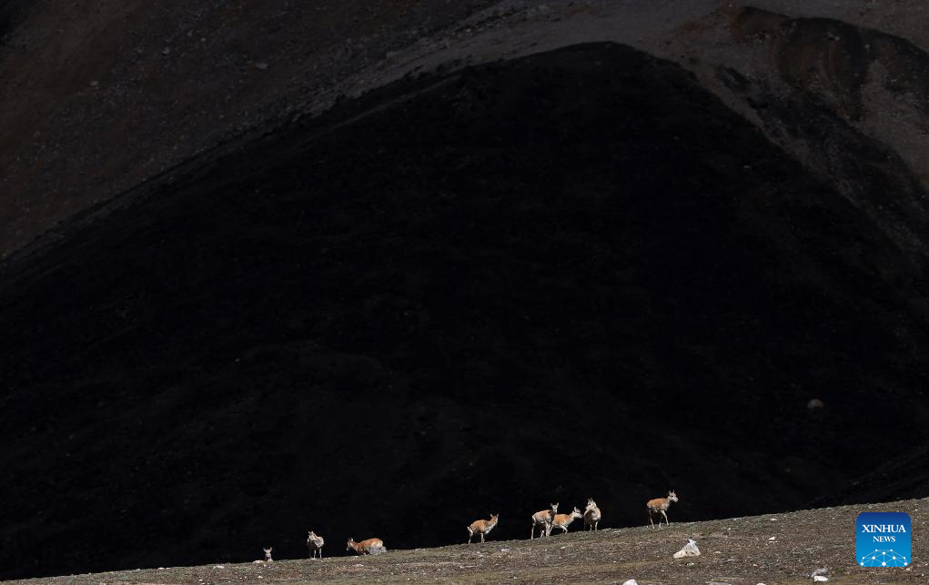 This photo taken on July 9, 2023 shows Tibetan antelopes in the Altun Mountains National Nature Reserve in northwest China's Xinjiang Uygur Autonomous Region. (Xinhua/Wang Peng)