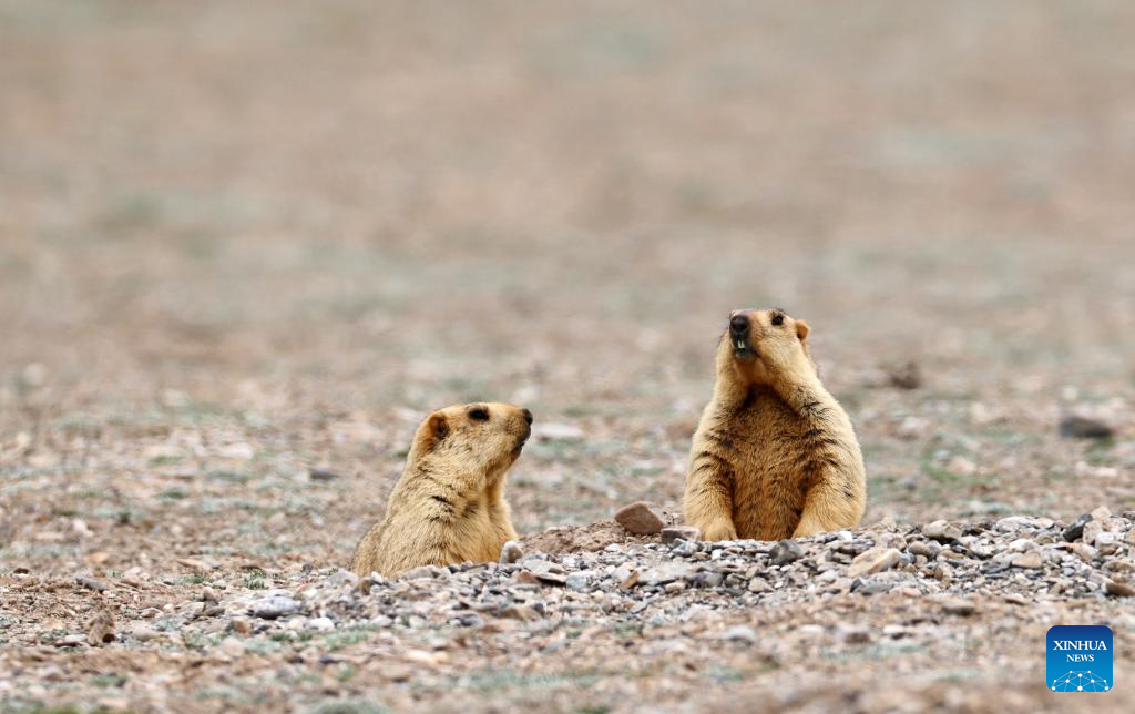 This photo taken on July 5, 2023 shows Himalayan marmots (Marmota himalayana) in the Altun Mountains National Nature Reserve in northwest China's Xinjiang Uygur Autonomous Region. (Xinhua/Wang Peng)