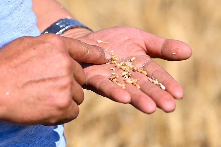 A farmer checks wheat grains in Hutubi County, northwest China's Xinjiang Uygur Autonomous Region, July 15, 2023. (Xinhua/Ding Lei)