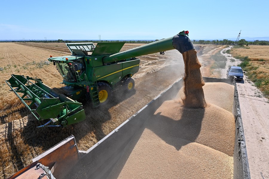 Wheat grains are loaded onto a truck in Hutubi County, northwest China's Xinjiang Uygur Autonomous Region, July 15, 2023. (Xinhua/Ding Lei)
