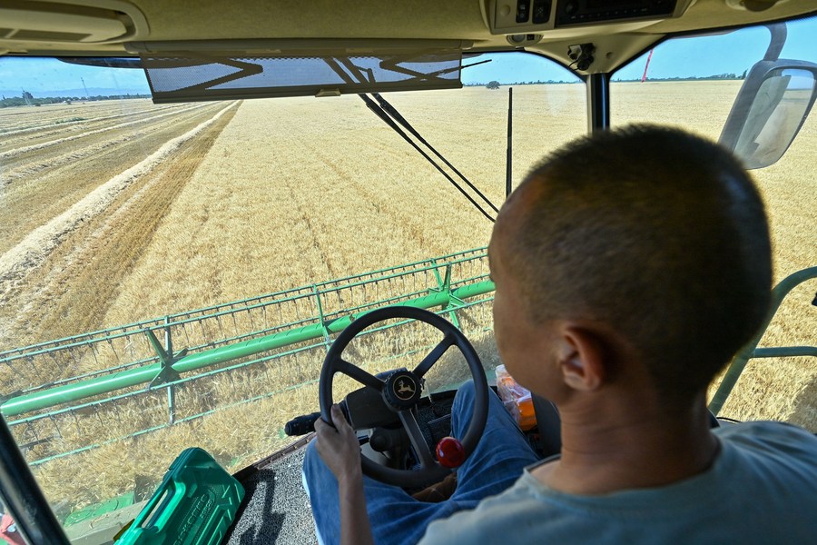 This photo taken on July 15, 2023 shows a farmer harvesting wheat in Hutubi County, northwest China's Xinjiang Uygur Autonomous Region. (Xinhua/Ding Lei)
