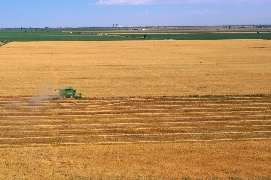 This aerial photo taken on July 15, 2023 shows farmers harvesting wheat in Hutubi County, northwest China's Xinjiang Uygur Autonomous Region. (Xinhua/Ding Lei)
