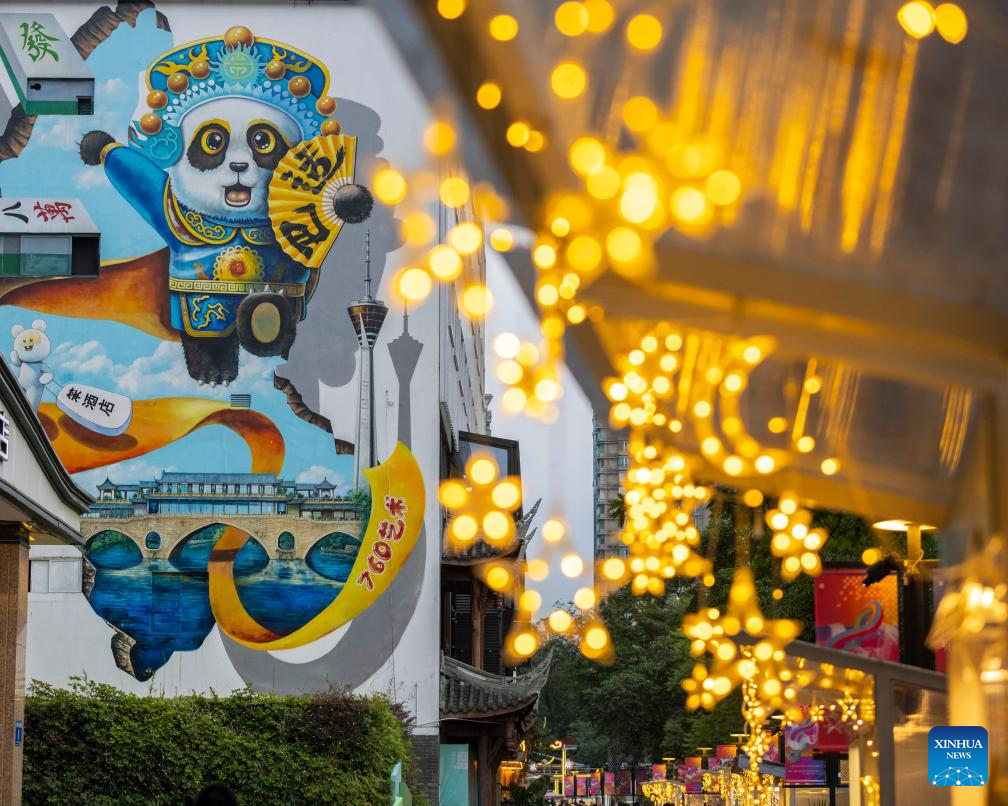A visitor walks on a gourmet street in Chengdu of southwest China's Sichuan Province, on June 25, 2023. The 31st FISU Summer World University Games is scheduled to take place in Chengdu from July 28 to August 8, 2023. (Xinhua/Shen Bohan)
