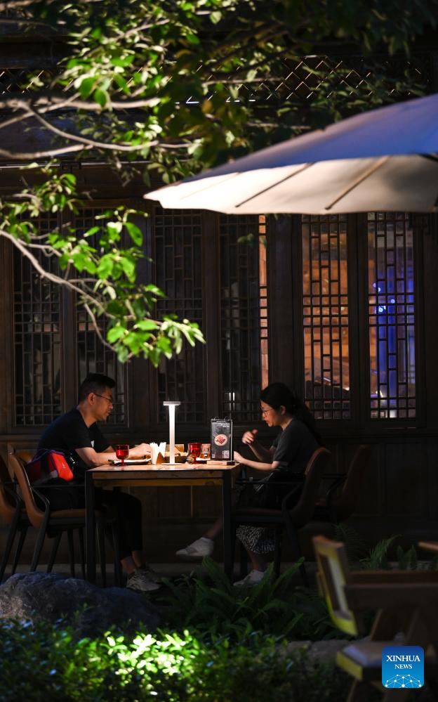 People have dinner at a restaurant in Chengdu of southwest China's Sichuan Province, on July 14, 2023. The 31st FISU Summer World University Games is scheduled to take place in Chengdu from July 28 to August 8, 2023. (Xinhua/Wang Xi)