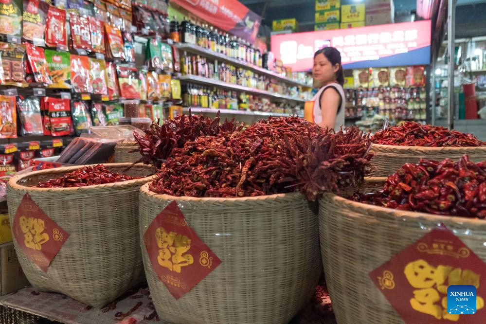 Red peppers are seen at a shop in Chengdu of southwest China's Sichuan Province, on July 14, 2023. The 31st FISU Summer World University Games is scheduled to take place in Chengdu from July 28 to August 8, 2023. (Xinhua/Tang Wenhao)