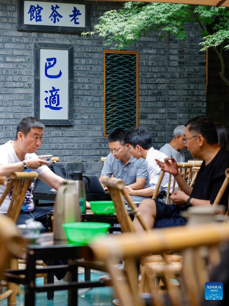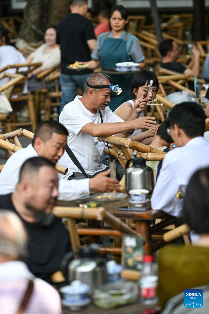People enjoy tea at an open tea house in Chengdu of southwest China's Sichuan Province, on July 14, 2023. The 31st FISU Summer World University Games is scheduled to take place in Chengdu from July 28 to August 8, 2023. (Xinhua/Wang Xi)