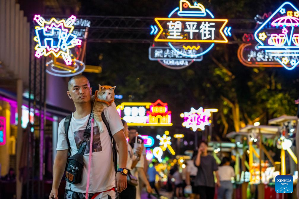 A man is seen with his cat while walking on a street in Chengdu of southwest China's Sichuan Province, on July 1, 2021. The 31st FISU Summer World University Games is scheduled to take place in Chengdu from July 28 to August 8, 2023. (Xinhua/Shen Bohan)