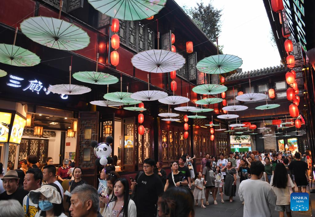 Tourists visit the Jinli folklore street in Chengdu of southwest China's Sichuan Province, on July 14, 2023. The 31st FISU Summer World University Games is scheduled to take place in Chengdu from July 28 to August 8, 2023. (Xinhua/Liu Kun)