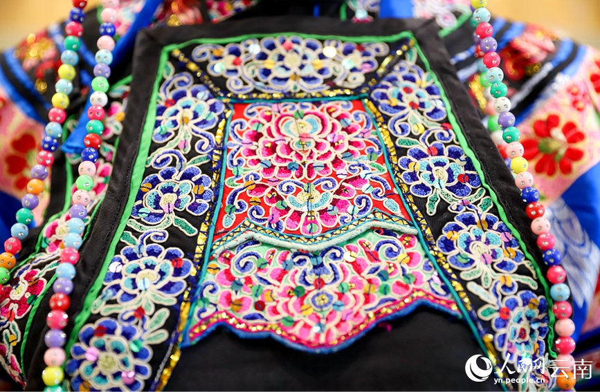 An exquisite costume of Yi embroidery at an exhibition featuring Yi embroidery in Nanhua county, Chuxiong Yi Autonomous Prefecture, southwest China's Yunnan Province. (People's Daily Online/Hu Zunhui)