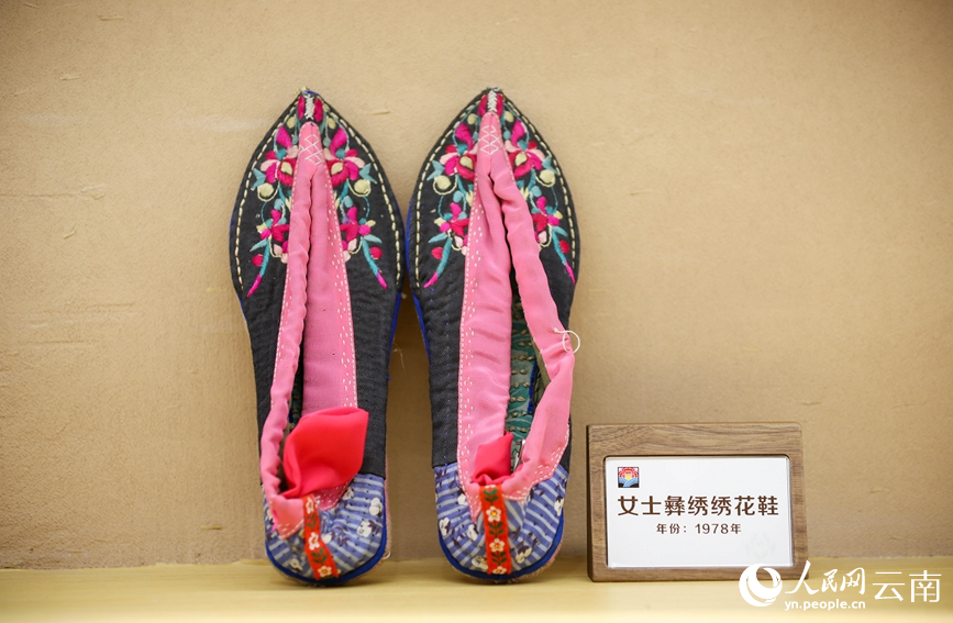 Yi embroidered shoes at an exhibition featuring Yi embroidery in Nanhua county, Chuxiong Yi Autonomous Prefecture, southwest China's Yunnan Province. (People's Daily Online/Hu Zunhui)