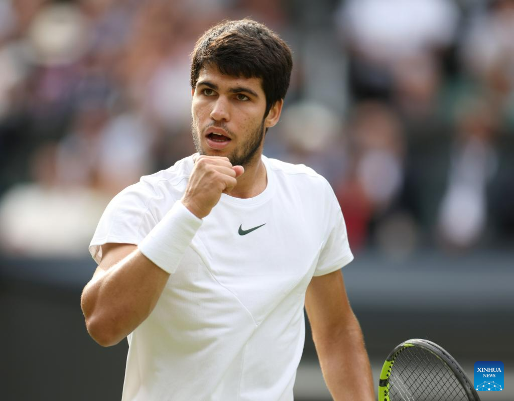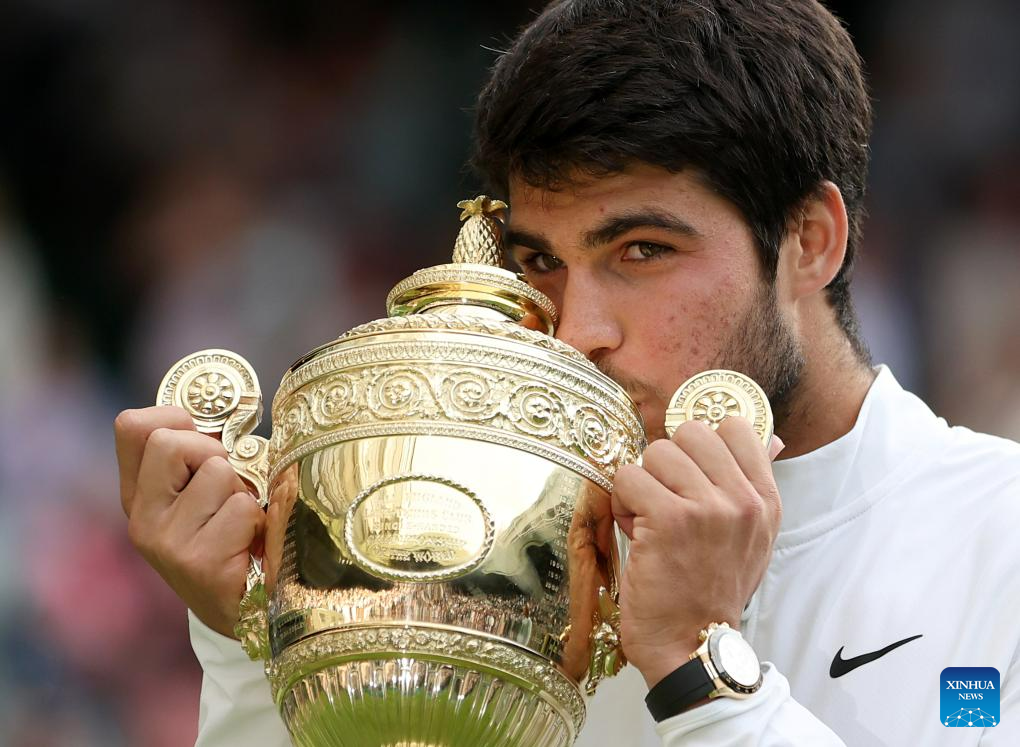 LONDON, July 16 (Xinhua) -- World No. 1 Carlos Alcaraz of Spain thwarted Novak Djokovic's quest for a record-leveling 24th Grand Slam title at Wimbledon on Sunday. Overcoming an early setback, the 20-year-old defeated second-seeded Djokovic 1-6, 7-6 (6), 6-1, 3-6, 6-4 to clinch his second Grand Slam trophy.