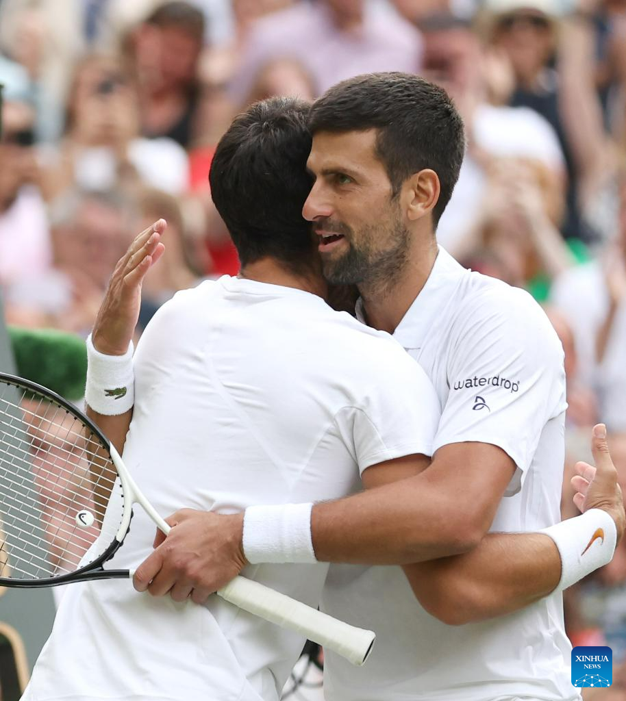 Players greet each other after the men's singles final match between Novak Djokovic of Serbia and Carlos Alcaraz of Spain at Wimbledon Tennis Championships in London, Britain, July 16, 2023. (Xinhua/Li Ying)