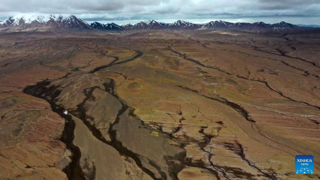 This aerial photo taken on June 30, 2023 shows a wetland in the Altun Mountains National Nature Reserve in northwest China's Xinjiang Uygur Autonomous Region. With an average altitude of 4,580 meters, the Altun Mountains National Nature Reserve covers a total area of 45,000 square kilometers and is a representative of plateau desert ecosystem in China. (Xinhua/Cai Yang)
