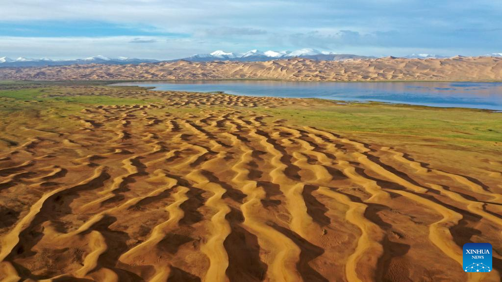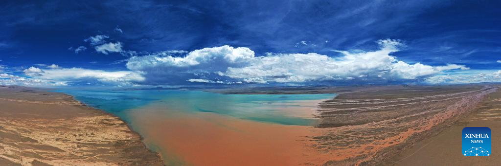 This aerial photo taken on July 5, 2023 shows a lake in the Altun Mountains National Nature Reserve in northwest China's Xinjiang Uygur Autonomous Region. With an average altitude of 4,580 meters, the Altun Mountains National Nature Reserve covers a total area of 45,000 square kilometers and is a representative of plateau desert ecosystem in China. (Xinhua/Wang Peng)