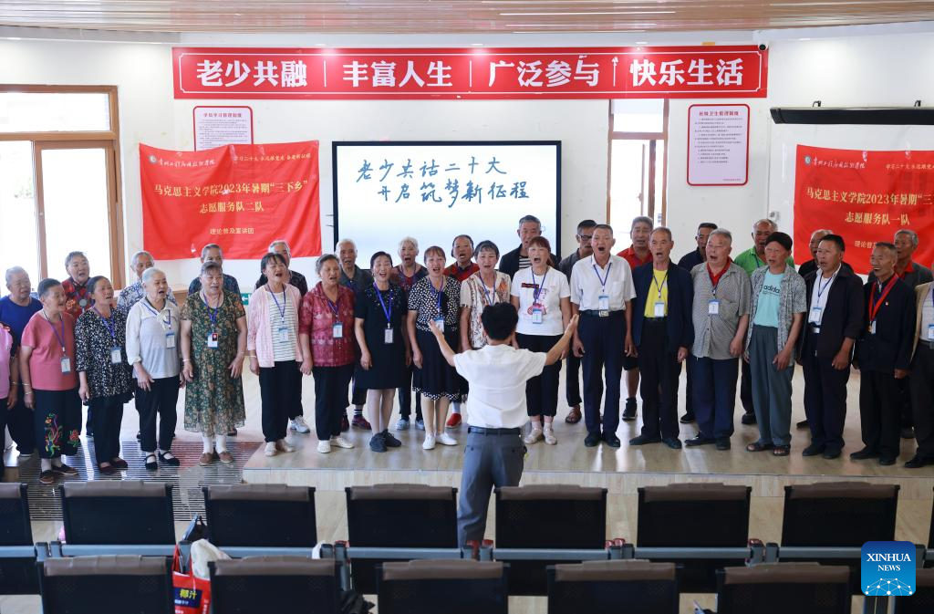 Senior citizens practice singing at a day care center in Baiyanglin sub-district in Bijie City of southwest China's Guizhou Province, July 13, 2023. Baiyanglin sub-district, home to nearly 30,000 residents, is the largest single relocation site for poverty alleviation in Guizhou. In addition to mobilizing all possible resources to improve employment and income for the residents, local authorities managed to build and operate a number of schools, kindergartens, day care centers, and clinics for the young, the aged, and the ailing ones. (Xinhua/Liu Xu)