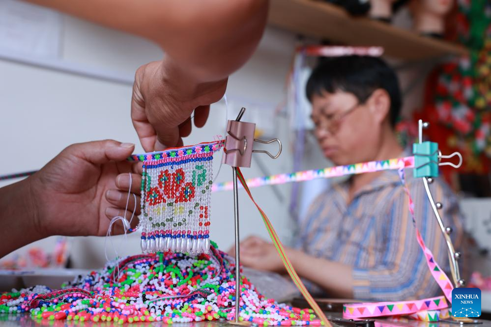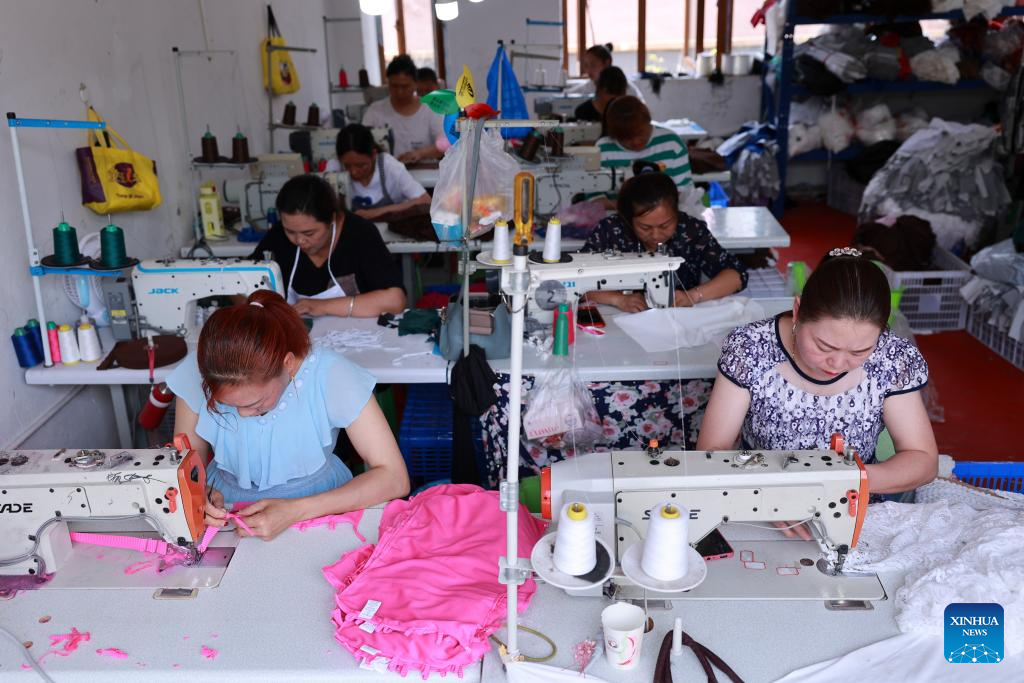 Relocated residents work at a workshop for employment facilitation in Baiyanglin sub-district in Bijie City of southwest China's Guizhou Province, July 13, 2023. Baiyanglin sub-district, home to nearly 30,000 residents, is the largest single relocation site for poverty alleviation in Guizhou. In addition to mobilizing all possible resources to improve employment and income for the residents, local authorities managed to build and operate a number of schools, kindergartens, day care centers, and clinics for the young, the aged, and the ailing ones. (Xinhua/Liu Xu)