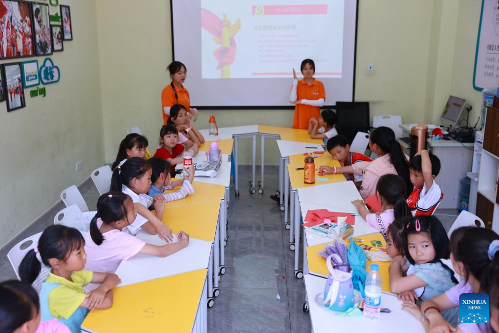 Volunteering college students give a lecture to children in Baiyanglin sub-district in Bijie City of southwest China's Guizhou Province, July 13, 2023. Baiyanglin sub-district, home to nearly 30,000 residents, is the largest single relocation site for poverty alleviation in Guizhou. In addition to mobilizing all possible resources to improve employment and income for the residents, local authorities managed to build and operate a number of schools, kindergartens, day care centers, and clinics for the young, the aged, and the ailing ones. (Xinhua/Liu Xu)
