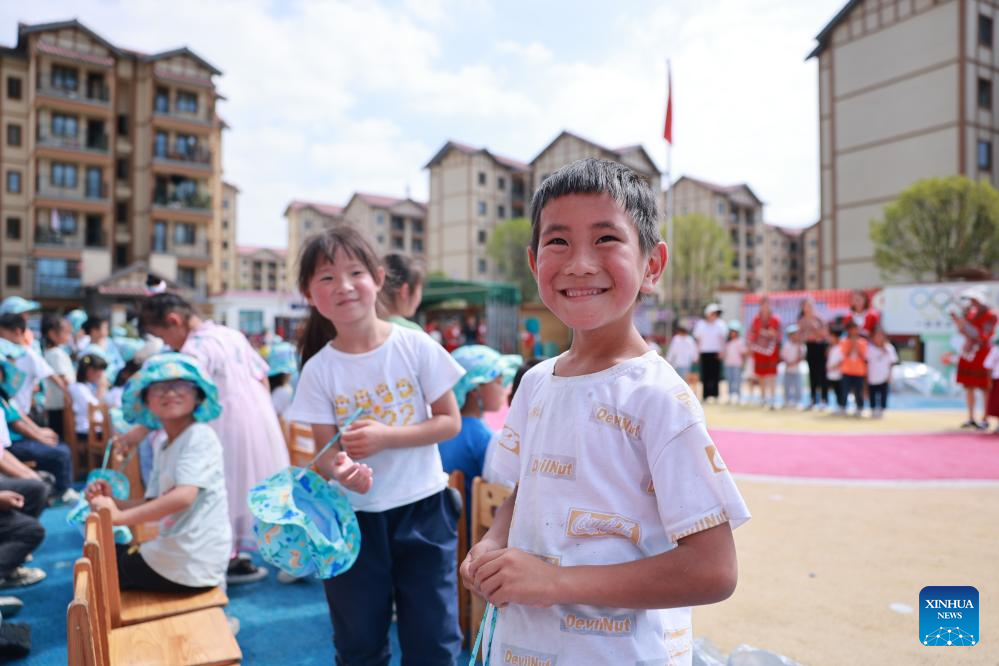 Children perform at a kindergarten in Baiyanglin sub-district in Bijie City of southwest China's Guizhou Province, July 13, 2023. Baiyanglin sub-district, home to nearly 30,000 residents, is the largest single relocation site for poverty alleviation in Guizhou. In addition to mobilizing all possible resources to improve employment and income for the residents, local authorities managed to build and operate a number of schools, kindergartens, day care centers, and clinics for the young, the aged, and the ailing ones. (Xinhua/Liu Xu)