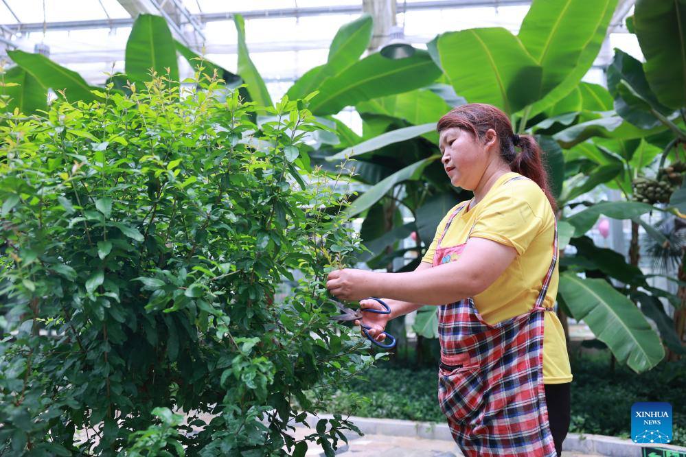 A relocated resident works at an ecological agriculture park in Baiyanglin sub-district in Bijie City of southwest China's Guizhou Province, July 13, 2023. Baiyanglin sub-district, home to nearly 30,000 residents, is the largest single relocation site for poverty alleviation in Guizhou. In addition to mobilizing all possible resources to improve employment and income for the residents, local authorities managed to build and operate a number of schools, kindergartens, day care centers, and clinics for the young, the aged, and the ailing ones. (Xinhua/Liu Xu)