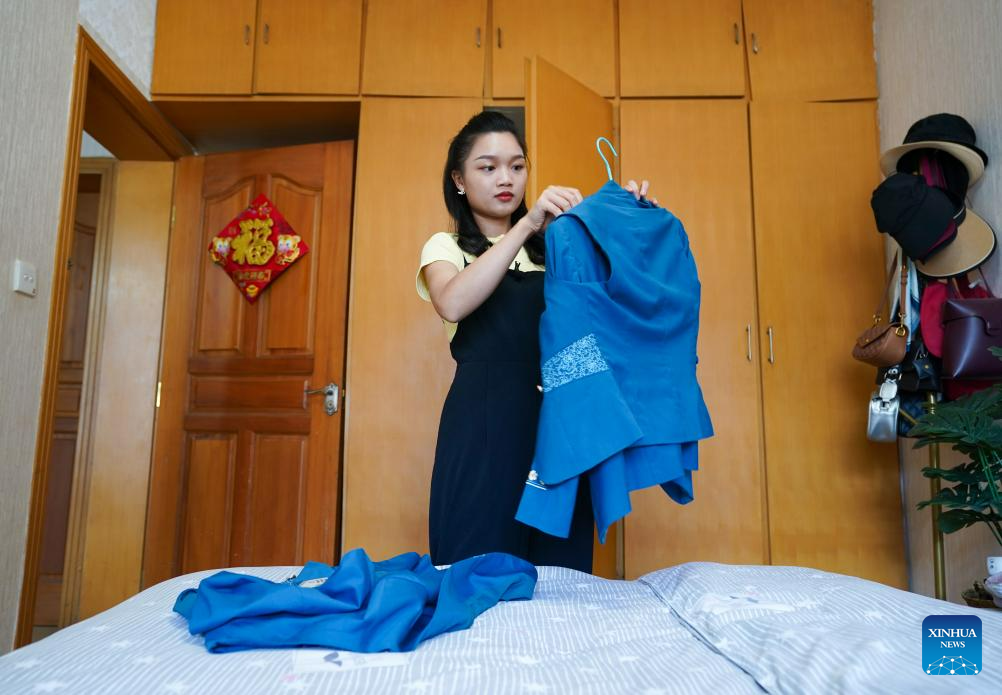 Yi Bofeng tidies up her work outfit at home in Kunming, southwest China's Yunnan Province, July 15, 2023. (Xinhua/Chen Xinbo)