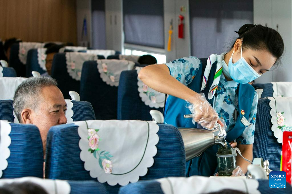 Yi Bofeng (C) serves passengers aboard the train D887 on July 16, 2023. (Xinhua/Chen Xinbo)