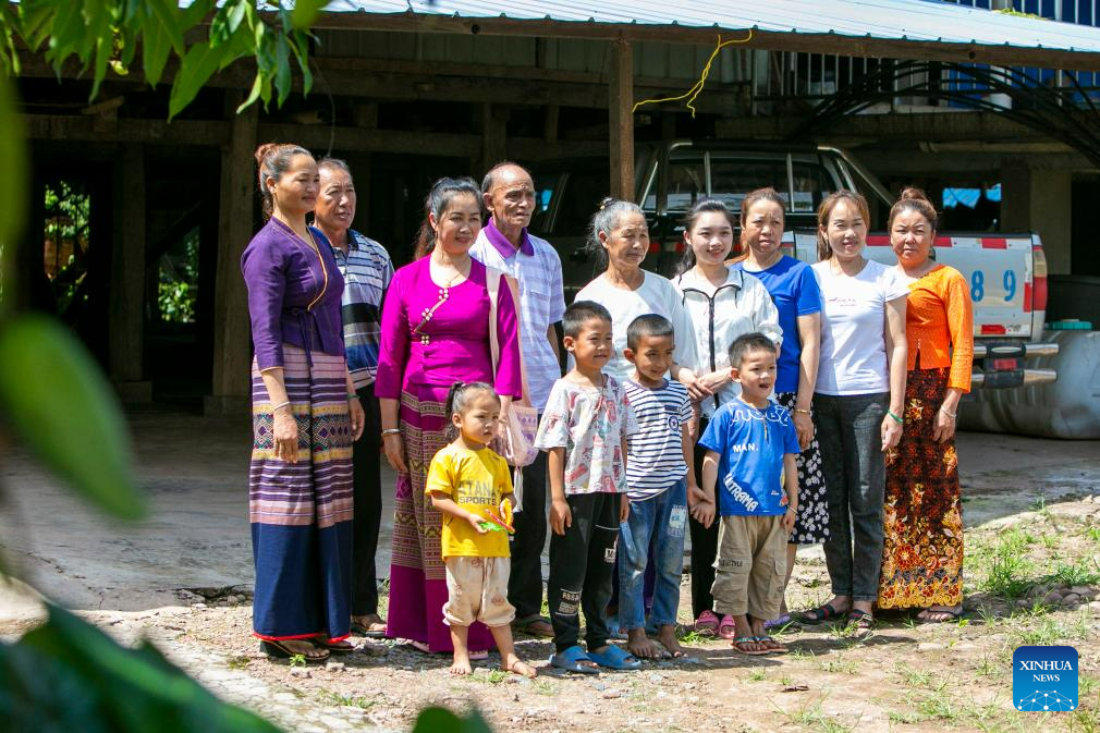 Yi Bofeng (4th R, rear) poses for a group photo with her family in Mengla County, southwest China's Yunnan Province, July 16, 2023. (Xinhua/Cui Wen)
