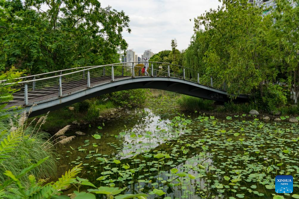 People walk in a park in Chengdu, capital of southwest China's Sichuan Province, July 14, 2023. The 31st International University Sports Federation (FISU) Summer World University Games will be held in Chengdu from July 28 to August 8. (Xinhua/Wang Xi)