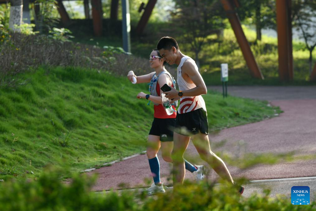 People jog at Tianfu Greenway in Chengdu, capital of southwest China's Sichuan Province, July 16, 2023. The 31st International University Sports Federation (FISU) Summer World University Games will be held in Chengdu from July 28 to August 8. (Xinhua/Xu Bingjie)