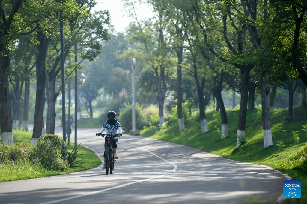 A citizen rides a bicycle at Tianfu Greenway in Chengdu, capital of southwest China's Sichuan Province, July 16, 2023. The 31st International University Sports Federation (FISU) Summer World University Games will be held in Chengdu from July 28 to August 8. (Xinhua/Xu Bingjie)