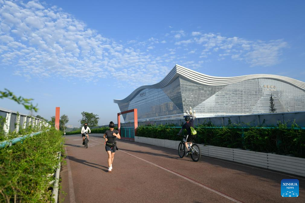 People do exercise at Tianfu Greenway in Chengdu, capital of southwest China's Sichuan Province, July 16, 2023. The 31st International University Sports Federation (FISU) Summer World University Games will be held in Chengdu from July 28 to August 8. (Xinhua/Xu Bingjie)