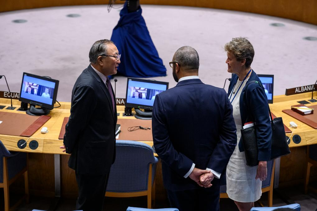 Zhang Jun (L), China's permanent representative to the United Nations, talks with other delegates before a UN Security Council briefing on artificial intelligence at the UN headquarters in New York, July 18, 2023. Zhang on Tuesday called for true multilateralism in developing artificial intelligence (AI) governance.?(Loey Felipe/UN Photo/Handout via Xinhua)