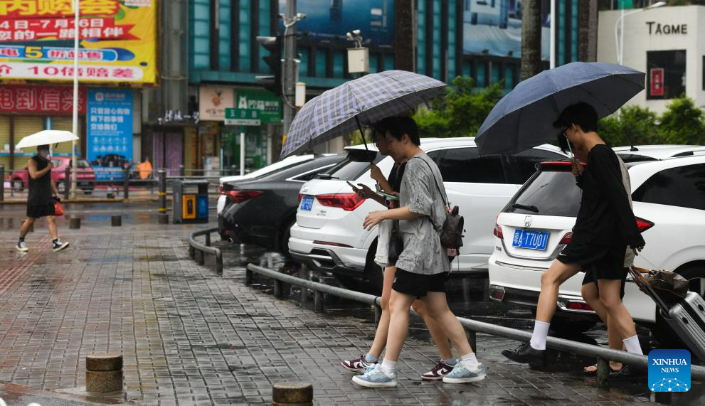 People walk in rain in Haikou, south China's Hainan Province, July 17, 2023. South China's island province of Hainan resumed the operation of flights and the Hainan Roundabout Railway on Tuesday, as Typhoon Talim, the fourth this year, weakened to the level of a tropical storm, said local authorities on Tuesday. (Xinhua/Yang Guanyu)