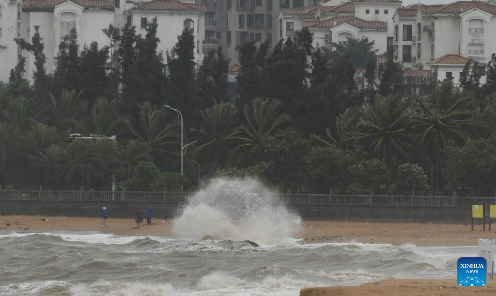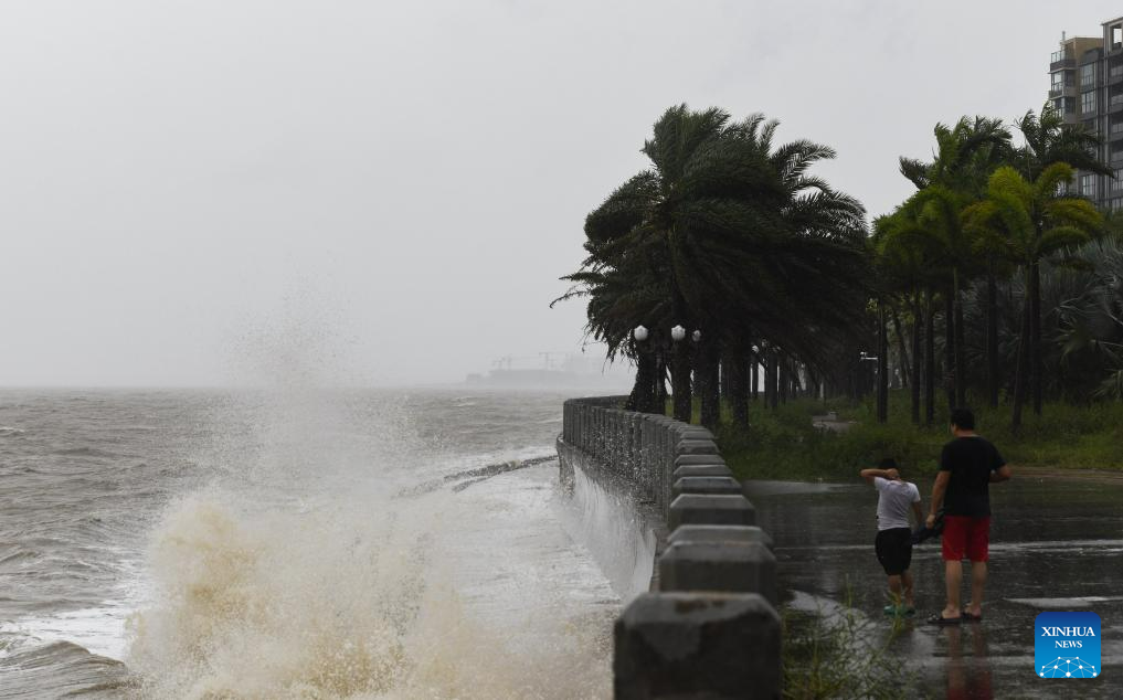 This photo taken on July 17, 2023 shows waves along the coast in Haikou, south China's Hainan Province. South China's island province of Hainan resumed the operation of flights and the Hainan Roundabout Railway on Tuesday, as Typhoon Talim, the fourth this year, weakened to the level of a tropical storm, said local authorities on Tuesday. (Xinhua/Yang Guanyu)