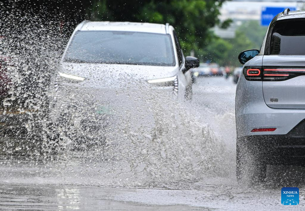 Vehicles pass on a waterlogged road in Wenchang, south China's Hainan Province, July 17, 2023. South China's island province of Hainan resumed the operation of flights and the Hainan Roundabout Railway on Tuesday, as Typhoon Talim, the fourth this year, weakened to the level of a tropical storm, said local authorities on Tuesday. (Xinhua/Pu Xiaoxu)