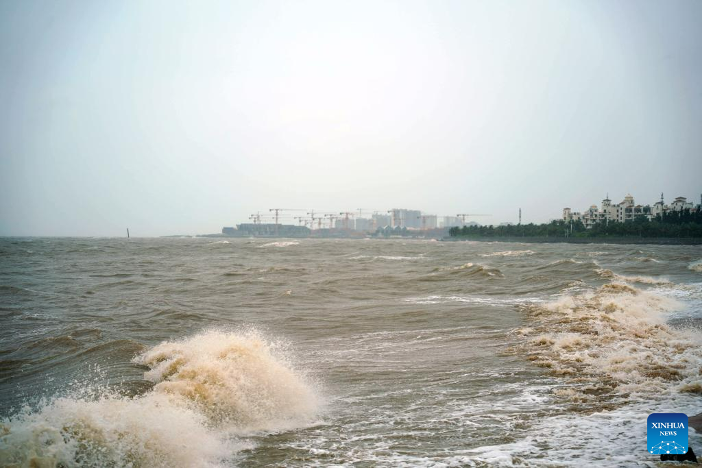 This photo taken on July 17, 2023 shows waves near Baishamen Beach in Haikou, south China's Hainan Province. South China's island province of Hainan resumed the operation of flights and the Hainan Roundabout Railway on Tuesday, as Typhoon Talim, the fourth this year, weakened to the level of a tropical storm, said local authorities on Tuesday. (Xinhua/Fan Yuqing)