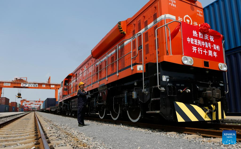 A China-Europe freight train bound for Hamburg, Germany waits for departure at Putian Station in Zhengzhou, capital of central China's Henan Province, July 18, 2023. Zhengzhou has handled 7,572 China-Europe freight trains which have carried 670,000 twenty-foot equivalent units (TEUs) of cargo since July 18, 2013. (Xinhua/Li Jianan)