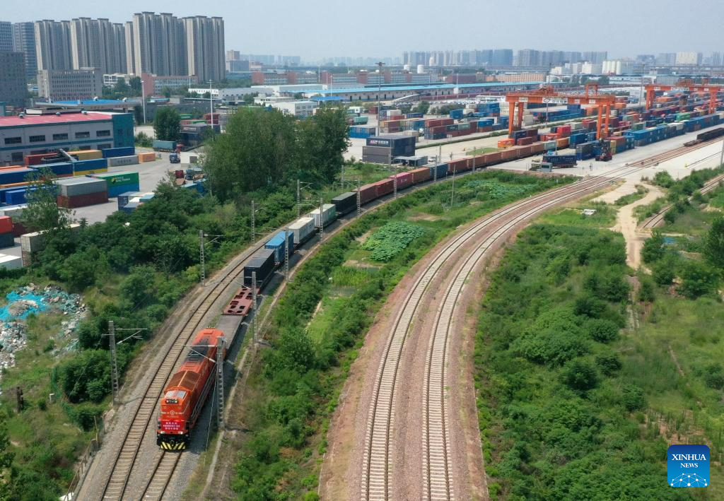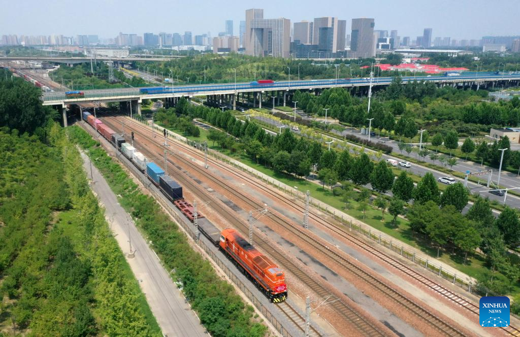 This aerial photo taken on July 18, 2023 shows a China-Europe freight train bound for Hamburg, Germany leaving Putian Station in Zhengzhou, capital of central China's Henan Province. Zhengzhou has handled 7,572 China-Europe freight trains which have carried 670,000 twenty-foot equivalent units (TEUs) of cargo since July 18, 2013. (Xinhua/Li Jianan)