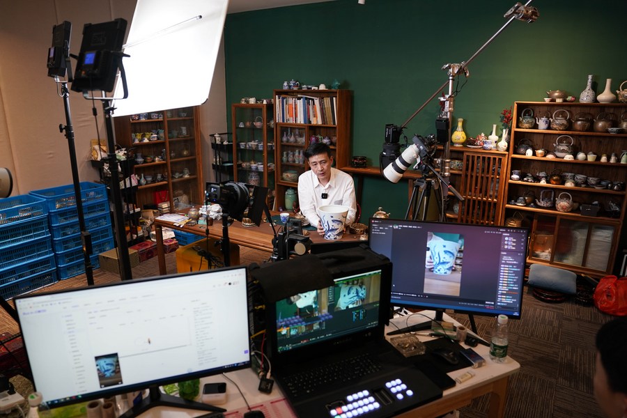 A staff member promotes porcelain products via a livestreaming show at Taoxichuan Ceramics Art Avenue in Jingdezhen, east China's Jiangxi Province, Feb. 22, 2023.(Xinhua/Zhou Mi)