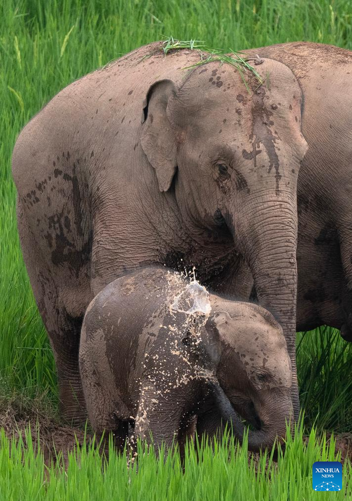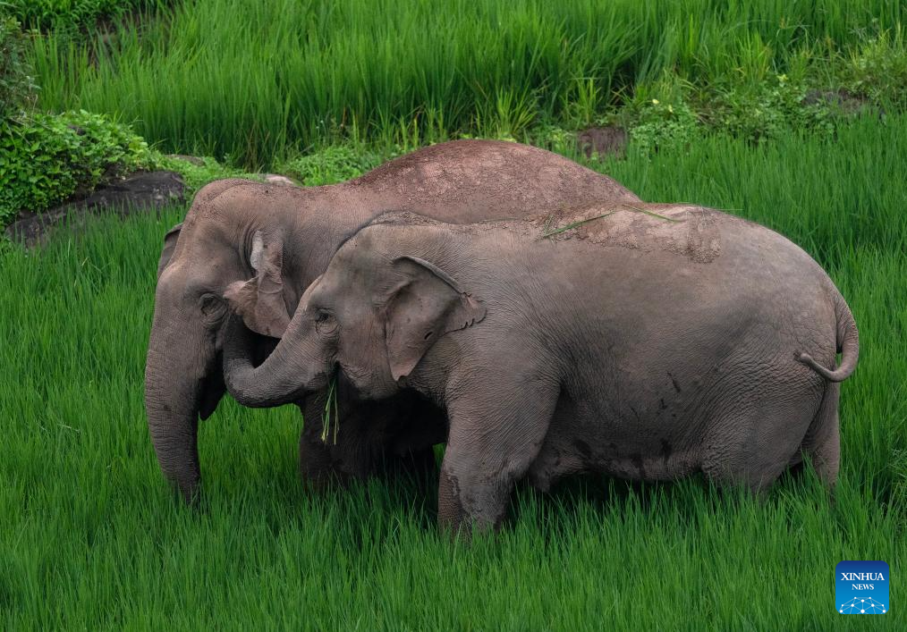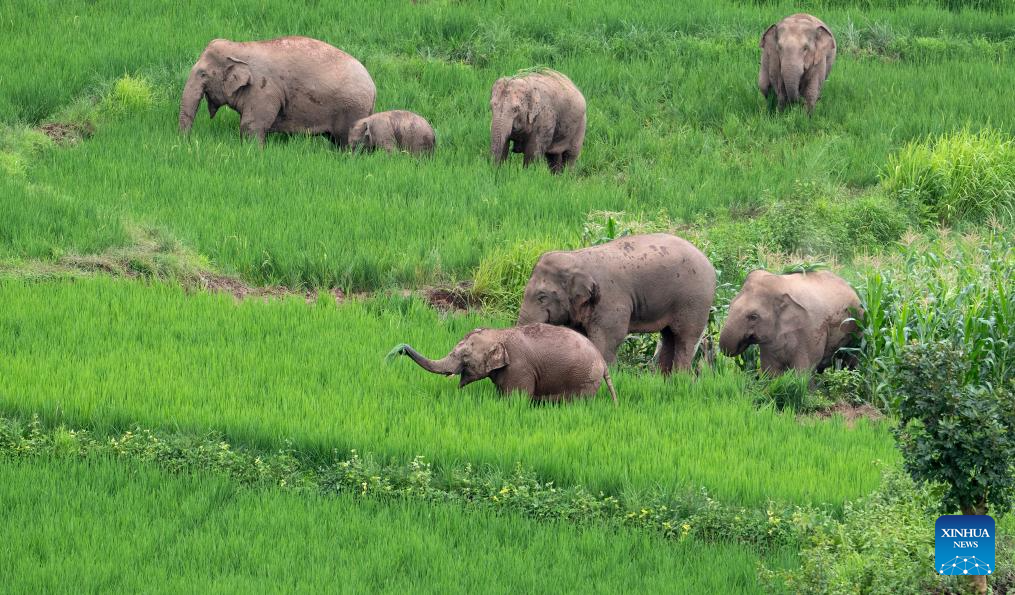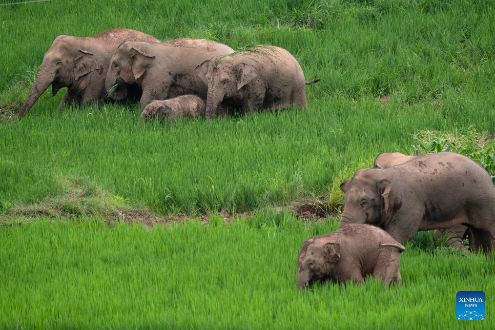 Asian elephants eat in rice fields in Jiangcheng Hani and Yi Autonomous County of Pu'er, southwest China's Yunnan Province, July 19, 2023. (Xinhua/Fei Maohua)