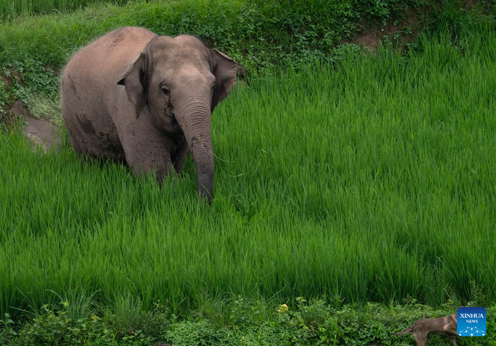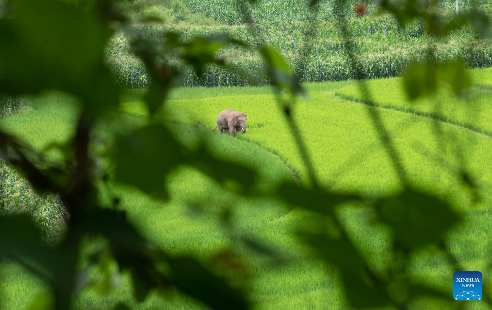 An Asian elephant eats in rice fields in Jiangcheng Hani and Yi Autonomous County of Pu'er, southwest China's Yunnan Province, July 19, 2023. (Xinhua/Fei Maohua)